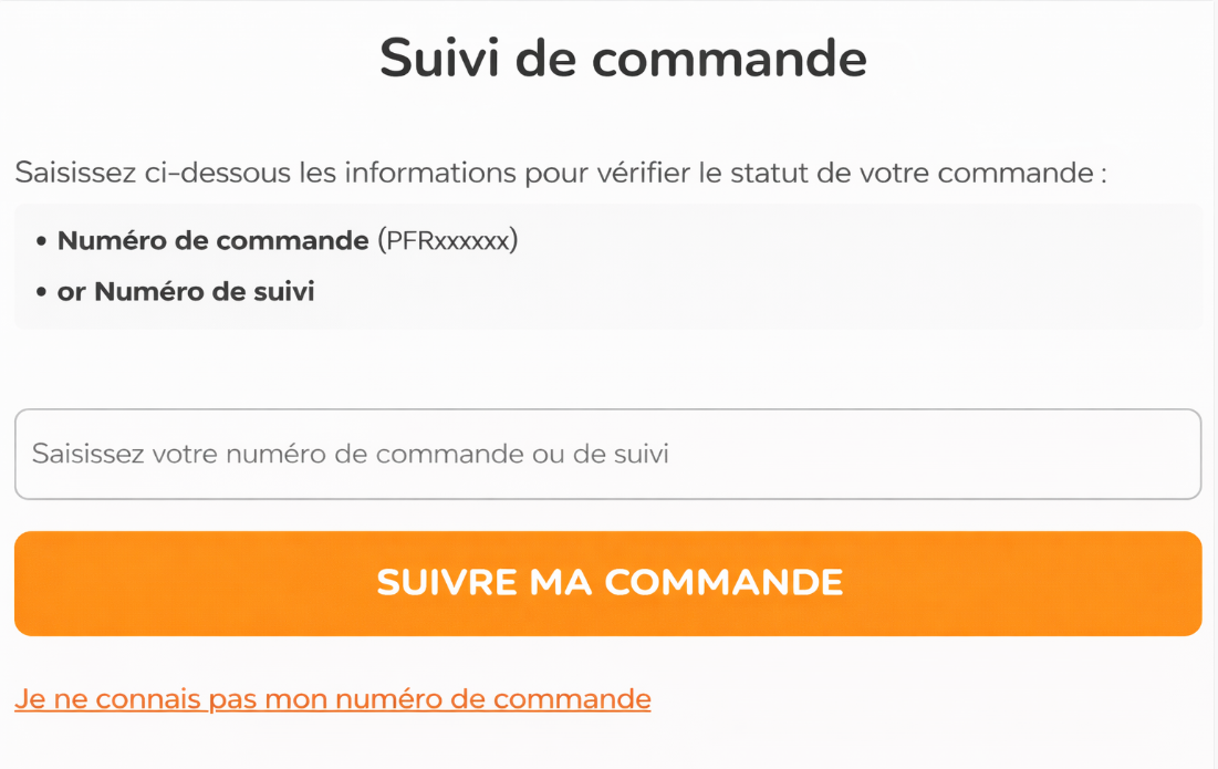 Utilisez notre page Suivi de Commande — il vous suffit d’entrer :