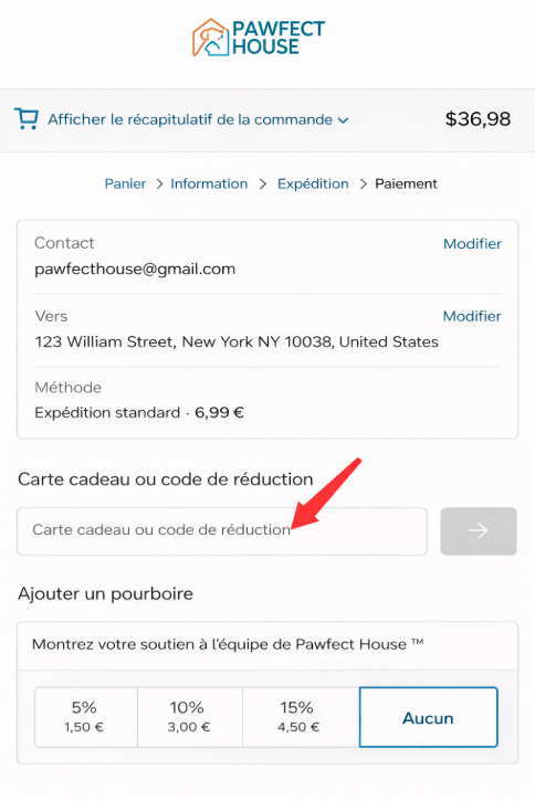 Étape 4 : Saisissez votre code de réduction dans le champ « Carte cadeau ou code de réduction ».